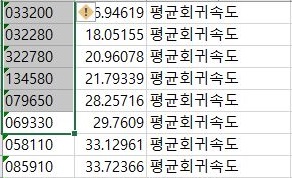 코스피에서 종목을 가지고 왔으니, 이번에는 코스닥의 half-life가 100이하인 종목들 중에서 30미만인 종목들만 추려서 가지고 오도록 합니다.