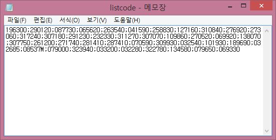 가지고 왔는 종목들을 txt파일에 위 스크린샷과 같이 집어 넣어서 ; 으로 서로를 구분해 주도록 합니다. 그리고 나서 다음으로 작업에 들어가 봅니다.