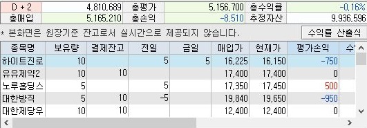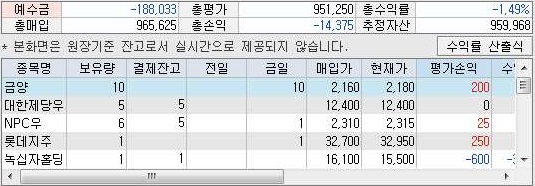그리고 나서 예수금은 여전히 -로 되어 있습니다. 아무튼 간에 이래서는 상당히 무리할 수 있는데, 문제는 저 예수금이 d + 2일 이후에 자본금이 얼마가 될지는 모르겠지만, 일단 이렇게 해서 판매할 주식이 있기 때문에, 그렇게 큰 일이 나지는 않으리라 생각이 됩니다.