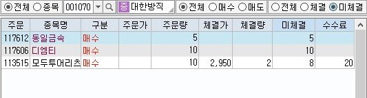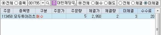 그리고 나서 나와서 미체결도 있는지를 한번 살펴 보았더니, 위 스크린샷에서 나와 있는 것처럼 매수하는 부분에 있어서 미체결이 있었습니다.