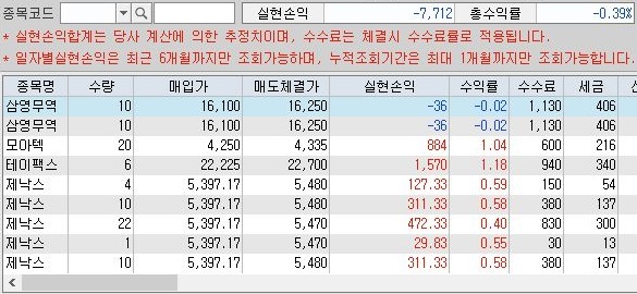 그리고 나서 예수금은 여전히 -로 되어 있습니다. 아무튼 간에 이래서는 상당히 무리할 수 있는데, 문제는 저 예수금이 d + 2일 이후에 자본금이 얼마가 될지는 모르겠지만, 일단 이렇게 해서 판매할 주식이 있기 때문에, 그렇게 큰 일이 나지는 않으리라 생각이 됩니다.