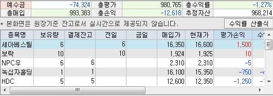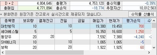 그리고 나서 잔고의 상황을 보는 중인데, 일단 너무 수익이 오른 애들을 많이 팔아서 인지 몰라도, 총 수익률이 낮아진 것을 볼 수 있었습니다. 일단 이런 상황에서 5일날 모의투자에서는 어떻게 되는지 살펴 보고자 합니다.