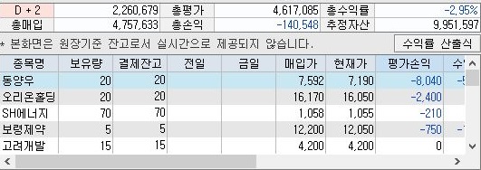 마지막으로 1000만원 주식을 가지고서 한번 작업을 하였는 계좌잔고를 보시겠습니다. 지난번 까지만 해도 2일 이후의 예수금이 마이너스가 되어 있었는데, 이제는 흑자로 돌아선 것을 확인할 수 있었습니다.