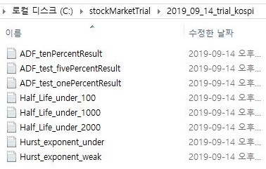 그리고 나서 위 스크린샷에서 보이는 것처럼 일단 일련의 결과를 얻는데 성공하기는 성공했습니다. 다만 여기서도 허스트 지수의 positive인 종목은 1개도 나오지 않은 것을 볼 수 있기는 있었습니다. 이제 다음으로는 이 txt파일들을 한번 비교 분석하는 일이 남아 있습니다.