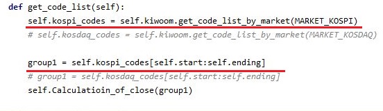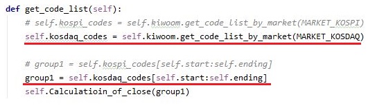그리고 나서 다음으로는 위 스크린샷에서 볼 수 있는 것처럼 이제 코스피를 끝냈기 때문에, 코스닥으로 갈아타기 위해서 코드를 바꾸어 봅니다.