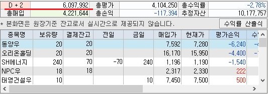 그리고 나서 잔고를 확인해 보니까, 어느새 2일 이후의 예수금의 양이 그럭저럭 상당히 늘어난 것을 확인할 수 있기는 있었습니다.