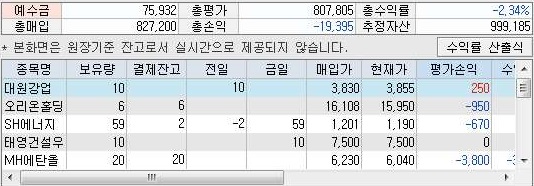 그리고 나서 위 스크린샷을 보시면, 한번 2일 이후의 예수금이 매도로 인해서 많이 줄어든 것을 확인할 수 있기는 있었습니다. 일단 여기까지 오기는 왔습니다. 이제 모의투자 한달이 거의 다 다가오기 때문에 이번주 까지가 이번 실험의 마지막인데, 이번주까지는 어느 조건에서 더 수익이 높은지에 대해서 한번 살펴본 다음에, 다음의 실험을 준비하도록 하겠습니다.