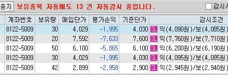 그리고 나서 자동감시 매매에서는 얼마나 많은 종목이 빠져 나갔는지에 대해서 한번 살펴 보고자 합니다. 일단 20개가 넘게 남아 있던 종목들이 이제 13건만 남았는 것을 확인할 수 있었습니다.
