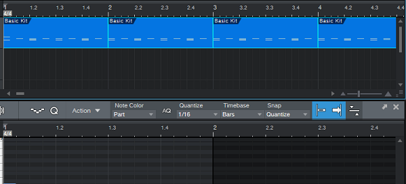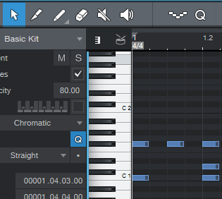 지난번 포스팅에서 끝낸 부분부터 이어서 하자면, 먼저 2초간의 한개의 리전안에 C1 노트-음표를 4개 배치해서 4박자를 만들었다면, 거기에 2개의 C#1 노트를 배치해서 한번 변화를 주도록 합니다.