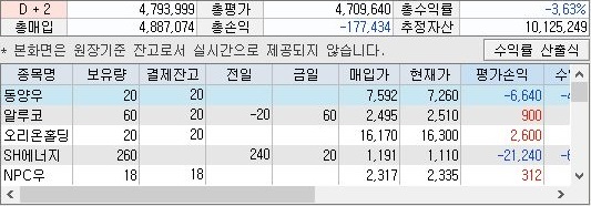 그래도 일단 위 스크린샷에서 볼 수 있듯이 아직 예수금이 마이너스가 된 것은 없습니다. 그렇지만 그래도 총수익률은 상당히 낮습니다. 아마도 이래저래 기본적 분석이 되지 않아서 매수를 한 다음에 주식의 가치가 내려가서 생긴 현상이 아닌가 합니다.