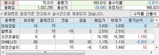 그래도 일단 위 스크린샷에서 볼 수 있듯이 아직 예수금이 마이너스가 된 것은 없습니다. 그렇지만 그래도 총수익률은 상당히 낮습니다. 아마도 이래저래 기본적 분석이 되지 않아서 매수를 한 다음에 주식의 가치가 내려가서 생긴 현상이 아닌가 합니다.