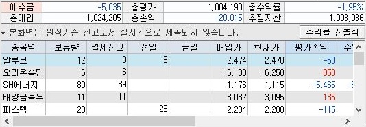 그리고 나서 잔고를 확인해 보도록 하겠습니다. 일단 2일 이후의 예수금도 좀 줄었는데, 문제는 총 수익률이 계속해서 마이너스 상태를 벗어나지 못하고 있습니다.