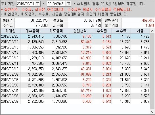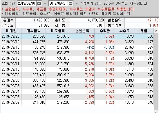 그리고 나서 9월 1일 부터 20까지의 결과를 한번 살펴 보았는데, 딱 1000만원 조건의 1/10이 되는 수준의 수익을 올린 것을 확인할 수 있기는 있었습니다.
