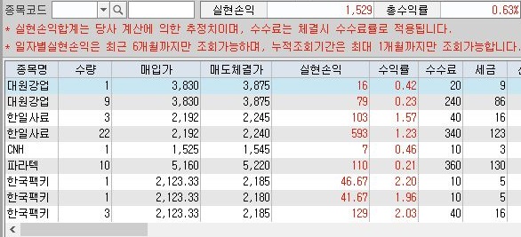 그리고 이제는 100만원 조건에서 한번 20일날 어떤 수익이 나왔는지에 대해서 한번 알아볼까 합니다. 일단 수익은 거의 1000만원 조건의 1/10 수준인 1500원대가 나왔습니다.