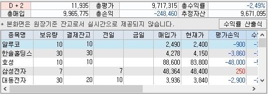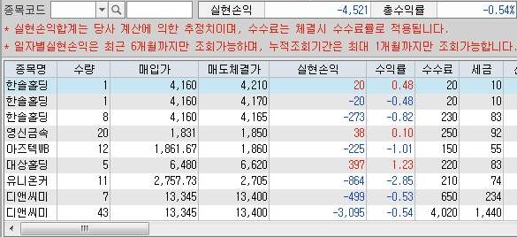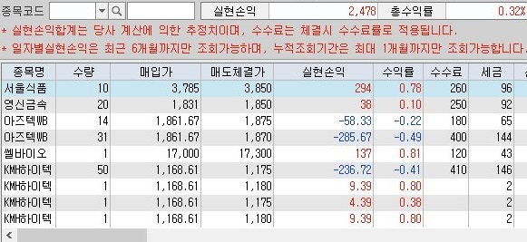 그리고 다소간에 손해를 보는 거래가 몇몇 있어서 인지 몰라도, 일단 위 스크린샷을 보시면 알 수 있듯이 일단 수익은 2400원 정도로 나오는 것을 확인할 수 있기는 있었습니다.