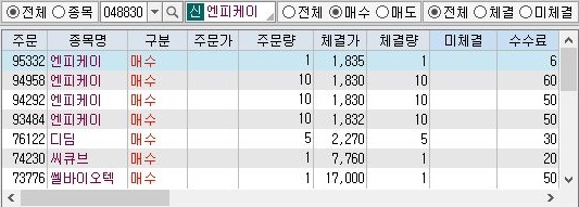 이렇게 해서 이제 오후 3시 30분이 되어서 중단이 되었습니다. 일단 condition 1이라고 해서 일단 대조군의 매수결과를 보고 있습니다. 이전에 워낙에 많이 사서인지 금요일에 매수 건수는 상당히 줄어든 것을 확인할 수 있습니다.
