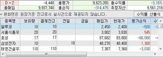 마지막으로 잔고를 확인해 보면, 위 스크린샷을 보시면 알 수 있듯이 일단 2일 이후의 예수금이 다시 플러스로 돌아는 왔는데, 여전히 총수익률이 좋지 않은 것을 볼 수 있습니다.