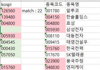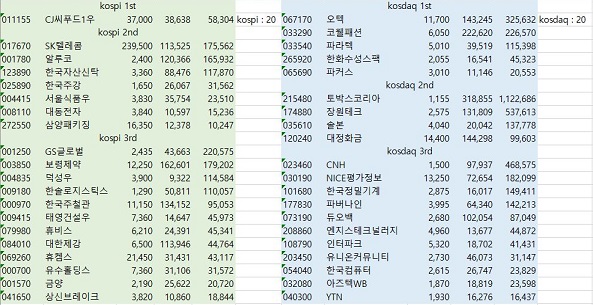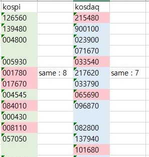 이렇게 해서 코스피에서 20개, 코스닥에서 20개씩 총 40개의 종목이 선정되었다는 것을 알 수 있었습니다. 이제 다음 작업은 이전의 결과와 한번 비교해 보는 것 입니다.