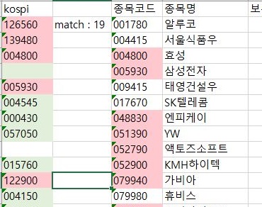 그리고 나서 지난주 결과와 한번 비교 분석해 보도록 했습니다. 방법은 엑셀의 중복값 비교를 했는데, 일단 지난주에서 가지고 올 수 있는 내용이라고는 겨우 위 스크린샷에서 보이는 것처럼 다 합쳐서 15 종목만이 나왔습니다.