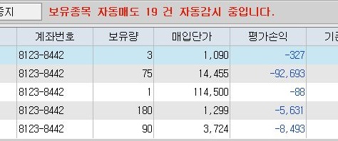 그리고 나서 다음으로 영웅문4 HTS를 작동 시켜서, 여기서 19개의 종목을 한번 위 스크린샷처럼 자동 매매감시 종목에 들어가 보도록 해야 합니다. 이렇게 하는 것으로 이제 작업이 마무리가 되기는 되었습니다만, 문제는 무슨 이유에서 인지 몰라도 이렇게 지난주에서 선정된 많은 종목들이 대거 떨어져 나간 것이 문제라면 문제입니다.