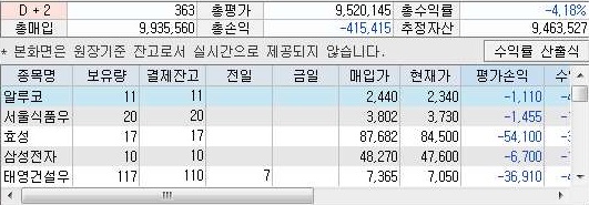 마지막으로 실험군인 condition 2번의 잔고를 확인한 상황입니다. 여기서도 한계없이 주식을 매수하다 보니, 손실률도 커지는 것을 확인할 수 있었습니다. 그런데 이걸 떠나서 매수 이후에 주식의 가격이 떨어지는 것이 보이는 것은 대조군이나 실험군이나 마찬가지라서, 무언가 다른 대책이 필요해 보이기는 합니다.