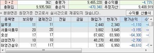 그리고 잔고를 확인해 보니, 수익도 손해도 없는 날에서 잔고는 큰 변동이 없이 그대로 있는 것을 볼 수 있습니다. 다만 문제는 총 수익률이 여전히 마이너스라서, 이래서는 앞으로는 계속해서 손해를 볼 수 밖에 없는데, 일단 이번 조건에서는 이렇게 가 보도록 하겠습니다.