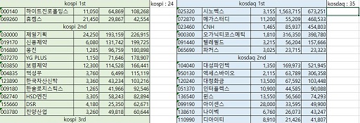 이렇게 해서 탈락한 종목들을 추려보니, 코스피에서는 24종목, 그리고 코스닥에서는 35종목이 나와서 총 59개의 종목을 선택할 수 있게 되었습니다.