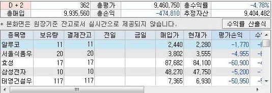 그래서 잔고 상황도 그다지 좋지 않은 것을 볼 수 있었습니다. 이래서야 수익을 하루에 낸다고 해도, 장기적으로는 전부 현금화를 할때, 상황이 좋지 않다는 것을 볼 수 있습니다. 일단 이렇게 해서 불발탄이 지난주에 이어서 연속으로 터진것을 볼 수 있었습니다.