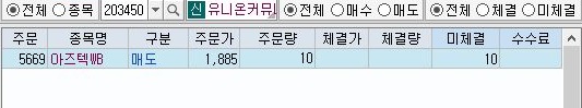 이렇게 해서 일단 7일날의 주식 모의투자가 끝이 났는데, 상황이 좋지 않아서 인지 몰라도, 위 스크린샷에서 볼 수 있는 것처럼 매도만 condition 1번에서 일어났는데, 미체결만 되고서 말았습니다.