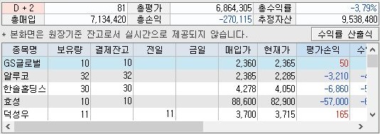 마지막으로 실험군인 condition 2번 조건의 잔고를 확인해 보면, 여기서도 총손익은 상당히 낮은 것을 확인할 수 있기는 있었는데, 일단 여전히 총손익에서는 계속해서 손해를 보는 식으로 되어 있는 것을 확인할 수 있었습니다. 아무래도 종목을 선정해야 하는 단계에서 좀 다음의 단계로 나아가야 겠다는 생각이 듭니다.