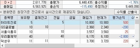 그런데 잔고를 확인해 보니, 마이너스 4%대까지 떨어졌던 총 수익률이 오르기는 올라서 1.7% 정도의 손실을 보고 있는 것으로 나오고 있습니다. 즉, 정말 손해를 심하게 보는 종목들이 떨어져 나간 것을 확인할 수 있었습니다.