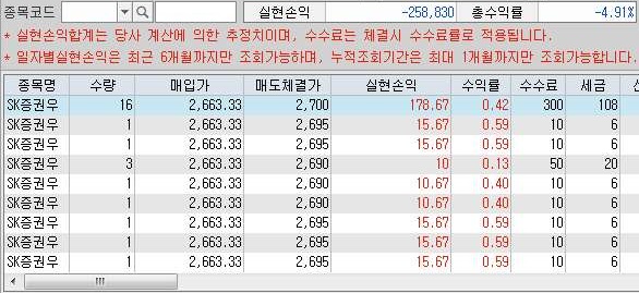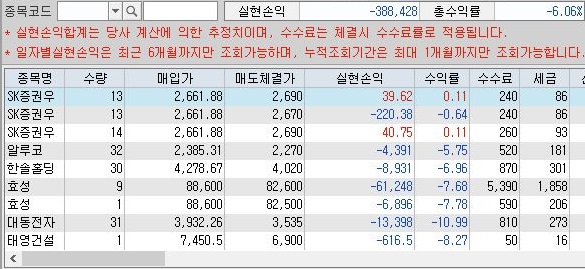 일단 여기서는 그런데로 이익을 본 종목의 갯수가 많아서 인지는 모르겠습니다만, 일단 위 스크린샷을 보시면 알 수 있듯이 25만 8천원의 손해를 본 것을 확인할 수 있었습니다.