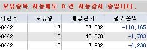 마지막으로 자동매매 감시 시스템에서 감시 중인 종목의 갯수가 10건 아래로 줄어든 것을 확인할 수 있었습니다. 이렇게 하는 것으로 10일 하루종일 상당히 많은 손절매가 있었으며, 여기서 나온 손절매 때문에 생각외로 큰 손해를 입은 것을 확인할 수 있었습니다.