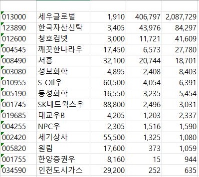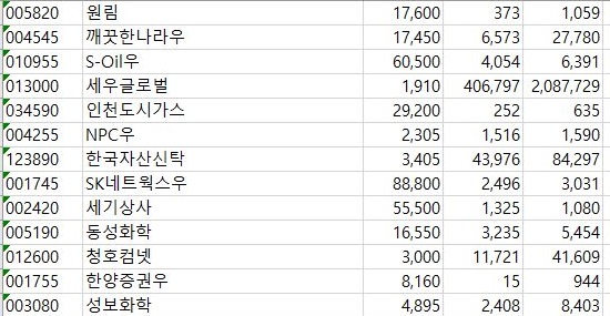 일단 이렇게 가지고 와서, 20일 평균 거래량을 기준으로 1차로 내림차순으로 정렬을 하고, 다음으로 거래량을 중심으로 내림차순으로 정렬해 보도록 합니다.