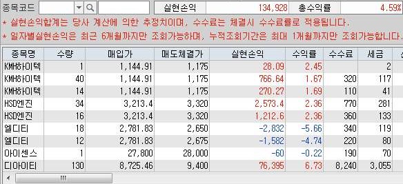 그리고 나서 수익이 얼마나 나왔는지 살펴 보자면, 몇몇 손실이 잇었음에도 불구하고, 위 스크린샷에서 볼 수 있는 것처럼 13만 4천원이 약간 넘는 수익을 거둔 것을 알 수 있습니다. 역시나 한계가 없다보니, 수익을 올릴 때도 상당히 크게 올리는 것 같습니다.