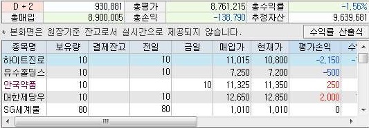 그리고 나서 잔고를 확인해 보면, 일단 위 스크린샷을 보시면 여전히 총 수익률이 마이너스라서, 이래저래 불안한 미래를 예고하고 있는 듯 합니다.