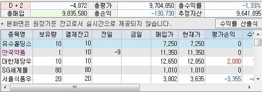 그리고 나서 condition 2번의 잔고를 확인해 보면, 위 스크린샷에서 보이는 것처럼 일단 1.33%의 손해가 나오는 총수익률을 볼 수 있는데, 이 결과를 보고 있자면, 앞으로 condition 1번과 condition 2번에서 수익이 나기 힘든 구조라는 생각이 듭니다.
