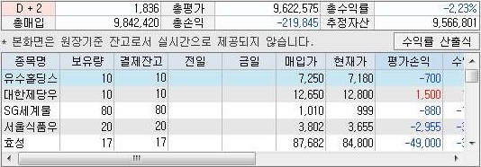 그리고 나서 다음으로 해야 할일은 condition 2번의 잔고를 확인해 봐야 하는데, 총 수익률이 매수하고 나서 하락을 하는 주식이 있어서 더 떨어진 것을 볼 수 있습니다. 이래서야 이걸 어떻게 평가해야 할지는 상당히 난감하다는 생각이 듭니다. 아무튼 이번 실험 다음에는 종목 선정부터 다시 해야겠다는 생각이 듭니다.