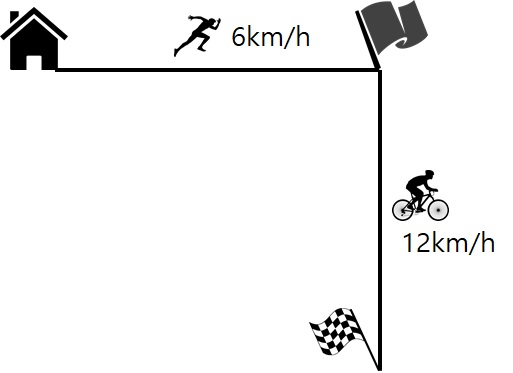 다음으로 설명을 해야 할 것은 조화 평균(harmonic mean) 입니다. 이 조화평균이라는 것은 우선 위 그림을 보시면, 한 사람이 처음에는 집에서 첫번째 포인트까지 시속 6킬로미터로 달렸고, 이후에 목표지점까지 자전거를 타고 시속 12킬로미터를 이동했습니다. 이럴 경우 이 사람이 평균 얼마나 되는 '속도'로 이동을 하였는지를 계산하는 데 사용이 됩니다.