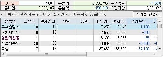 먼저 2일 이후의 현금이 증가하기는 해서 앞으로 장차 매수할 수 있는 주식의 양이 많아질 수 있습니다. 그러나 여전히 총 수익률이 마이너스인 상황에서는 그다지 앞으로의 상황이 그닥 좋아 보이지는 않습니다.