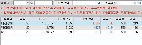 그런데 상황이 그다지 좋지 않았는지, 위 스크린샷을 보면 알 수 있는 것처럼 일단 실현손익이 마이너스로 나왔습니다. 다만 그 양이 상당히 미미하다는 것이 그나마 위안이 됩니다.