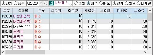 매수를 하는데 있어서 물량이 없어서 인지 몰라도, 일단 위 스크린샷처럼 매수에서 미체결 수량이 10개 발생하는 것을 제외하면 특별히 큰 이상은 없었습니다.