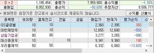 먼저 2일 이후의 현금이 증가하기는 해서 앞으로 장차 매수할 수 있는 주식의 양이 많아질 수 있습니다. 그러나 여전히 총 수익률이 마이너스인 상황에서는 그다지 앞으로의 상황이 그닥 좋아 보이지는 않습니다.
