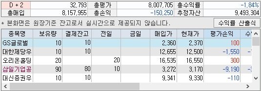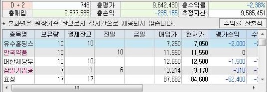 그리고 나서 잔고를 확인해 보니, 일단 위 스크린샷과 같이 총 수익률이 여전히 마이너스인 것을 확인할 수 있었습니다. 아무래도 처분해야 할 종목들이 계속해서 떨어지고만 있어서 문제인 듯 합니다.