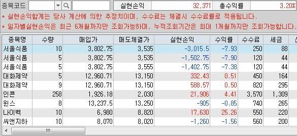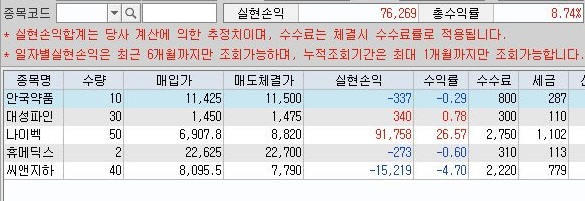 그리고 나서 한번 총 수익을 알아보니, 근래에는 보기 드물게 7만 6천원을 넘는 수익이 나오는 것을 확인할 수 있었습니다. 일단 이날에 좀 손해가 큰 거래가 하나 있었는데, 이것만 없었으면 9만원을 넘어갈 수 있었는데 아쉬웠습니다.