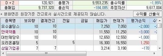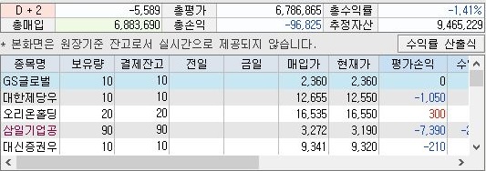 역시 마지막으로 한번 위 스크린샷에서 나오는 것처럼 일단 condition 2번의 잔고를 확인해 보니, 2일 이후 예수금의 상황은 나아진 것 같기는 합니다만, 총 수익률의 손해비율이 이전보다 더 올라간 것 같아 보여서 이래저래 미래가 상당히 불안하기는 불안합니다.
