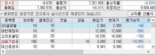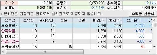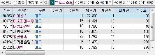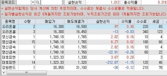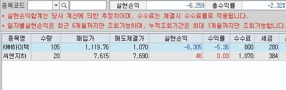 그런데 수량이 많은 종목의 거래가 바로 이루어 지지 않고, 지체가 되다가 현재가가 손해보는 가격으로 갔을 때 거래가 이루어져서 손해가 이만저만이 아닌 것을 볼 수 있습니다.