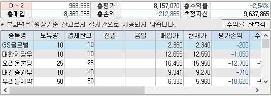 어찌된 것인지 총수익률과 추정자산의 총량이 오히려 감소한 것을 확인할 수 있었습니다. 아무래도 어디서 수익을 얻은 것을 더 많이 떨어지는 것으로 매꿔버리는 종목이 있다는 것 같습니다.