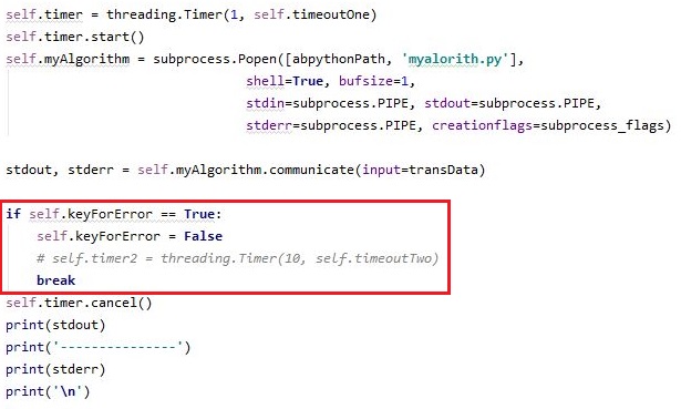 다음으로 해야 할일은 subprocess인 자식 프로세스로 커뮤니케이션이 들어간 다음에 시간이 지체가 되었으면, 기존의 for문에서 빠져나오도록 만들어 주도록 합니다.