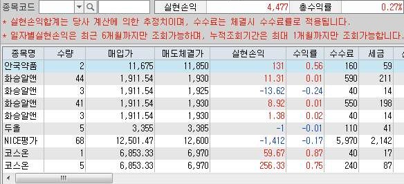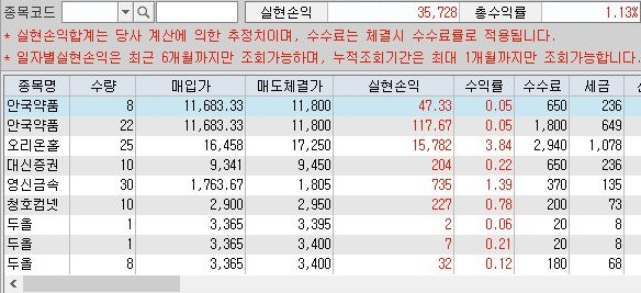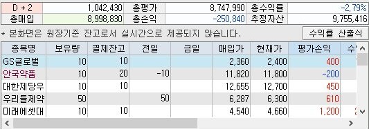그리고 나서 잔고를 확인해 보면, 총 손익이 25만원 손해로 나와 있는 것을 볼 수 있었습니다. 이래서는 순 이익이 이 이상을 상회해야 이익이 나왔다고 말할 수 있습니다.
